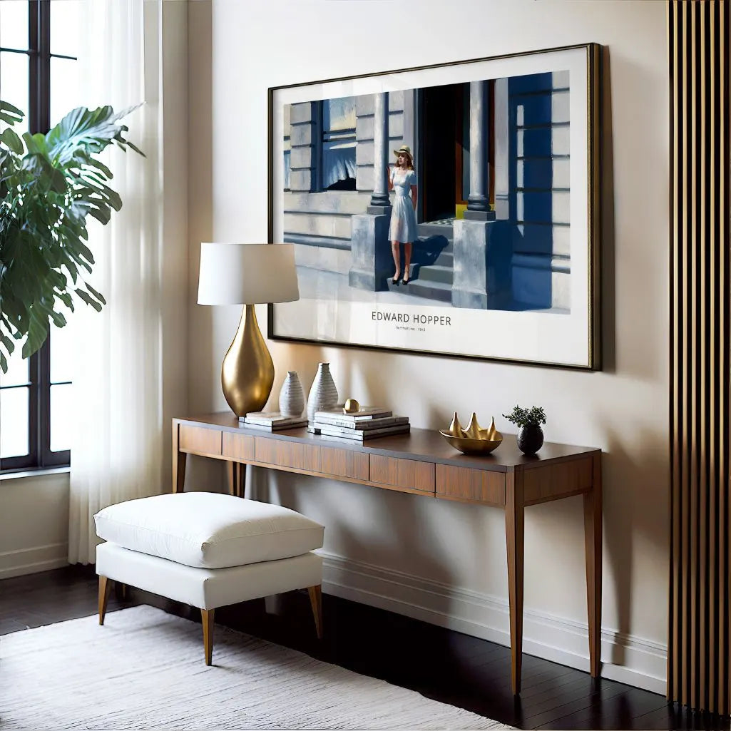 This Edward Hopper poster reproduces the iconic painting Summertime (1943) in a horizontal format, capturing a quiet moment of stillness and light. A solitary woman standing in the sun on the steps of a city townhouse becomes a poetic study of everyday life, where silence, warmth, and reflection take center stage. Hopper’s masterful use of light and shadow gives this wall art its timeless emotional depth.
