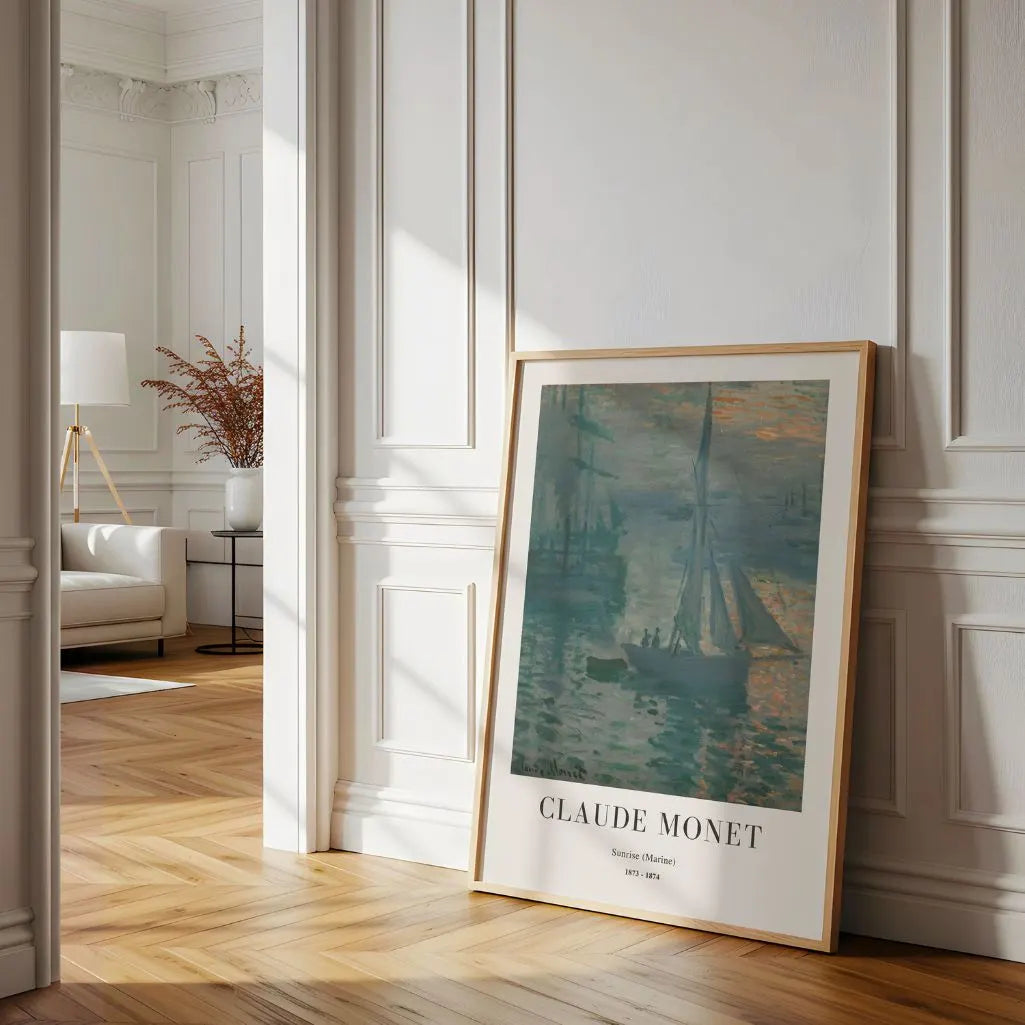 Bring the hush of early morning to your space with this Claude Monet Sunrise (Marine) poster, inspired by the harbor at Le Havre. Misty silhouettes of ships drift across calm water as a warm orange sun reflects softly on cool blue-gray tones—timeless impressionist wall art focused on atmosphere, light, and mood.