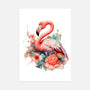 Flamingo in Flowers Poster is watercolor wall art featuring a graceful flamingo surrounded by blossoms. Juicy coral and pink tones combined with soft green leaves create a vibrant yet airy composition that instantly lifts the room. The floral frame adds elegance and freshness while keeping the overall look light, making it a striking accent without visual heaviness.