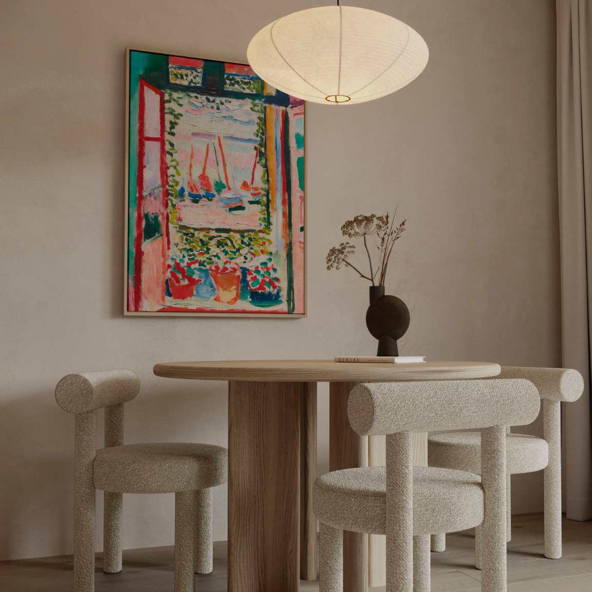 Add a bold burst of color to your space with this framed canvas print of Henri Matisse’s The Open Window (1905). An open, brightly painted window frame becomes a gateway to light, sea air, and a sunlit view—flowers, boats, and sky rendered with playful energy. Matisse’s early Fauvist palette brings vivid pinks, turquoise, reds, and greens together in a way that feels spontaneous and uplifting, using color to express emotion rather than realism.