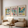 Together, these art reproductions create a cohesive story of greenery, sunlight, and modern colour confidence—perfect as a statement triptych or styled as individual accents. Available as a framed poster or an unframed print, the set suits modernist, Scandinavian, classic, artistic, and eclectic interiors.